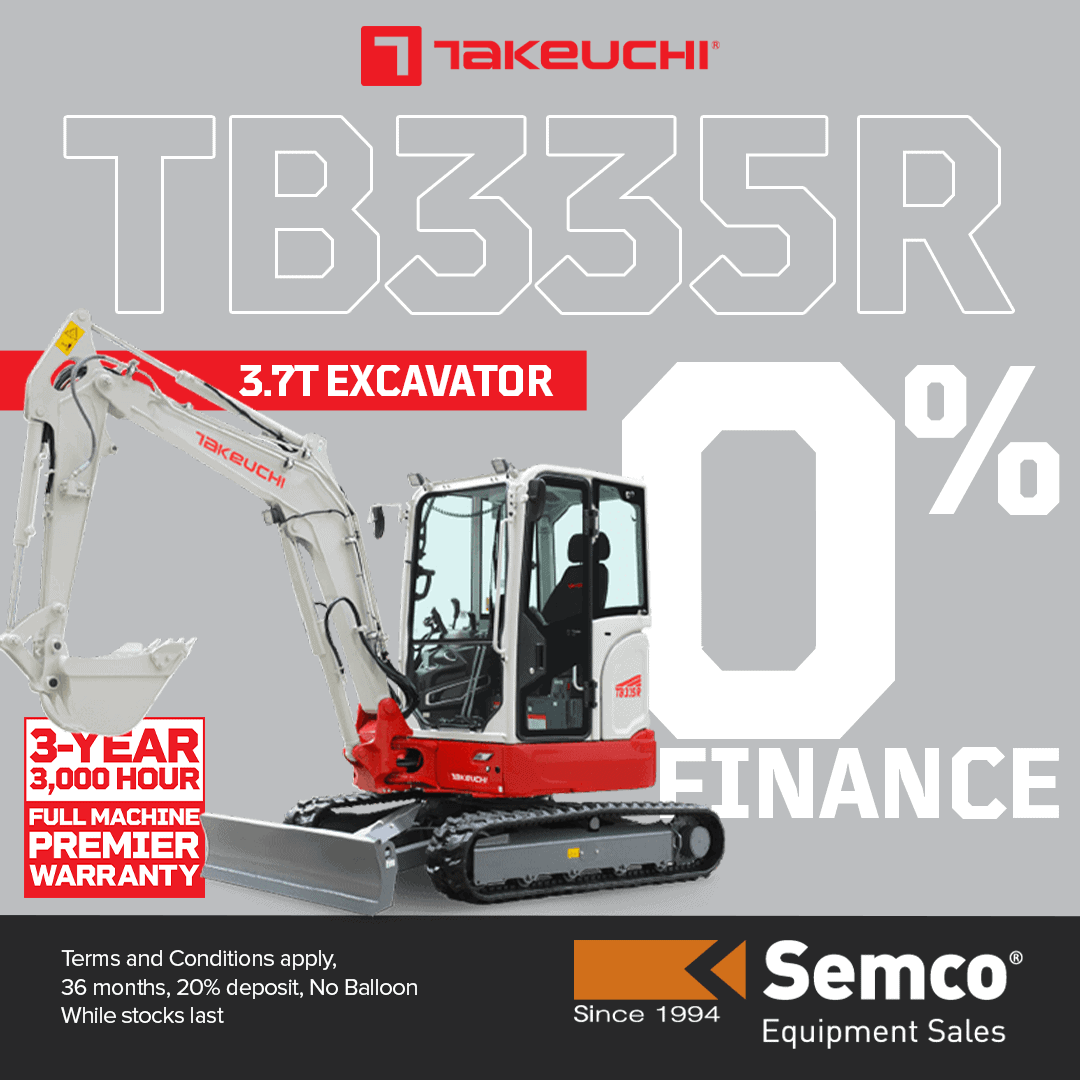 As Australia’s trusted Takeuchi distributor for over 26 years, Semco Group is proud to offer 0% finance on new TB335R purchases as part of our exclusive End of Year Offer — making it easier than ever to upgrade your fleet with one of the most advanced compact excavators in its class.